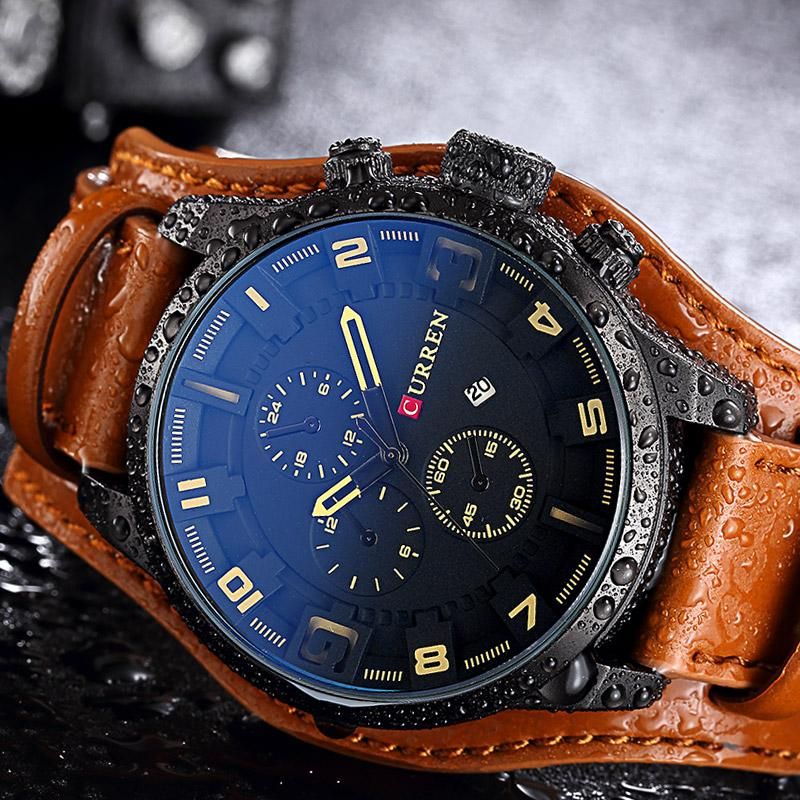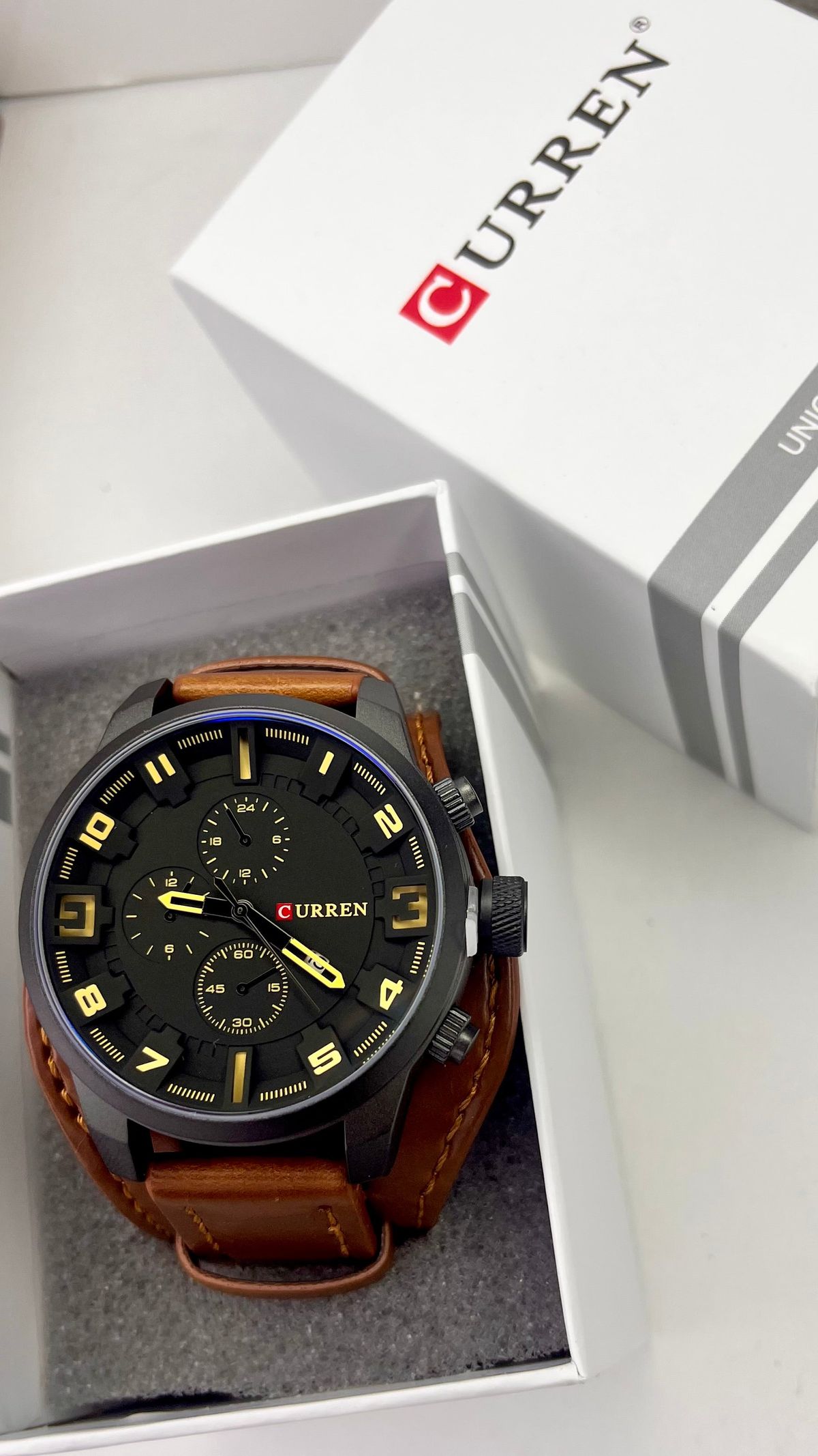 Pensée pour les hommes qui recherchent à la fois style et assurance, la montre Curren Chronograph se distingue par son design imposant et raffiné. Son cadran noir intense, sublimé par des détails dorés, incarne une esthétique moderne et affirmée. Associée à un bracelet en cuir marron clair, texturé et résistant, elle allie confort et charisme en toute occasion.