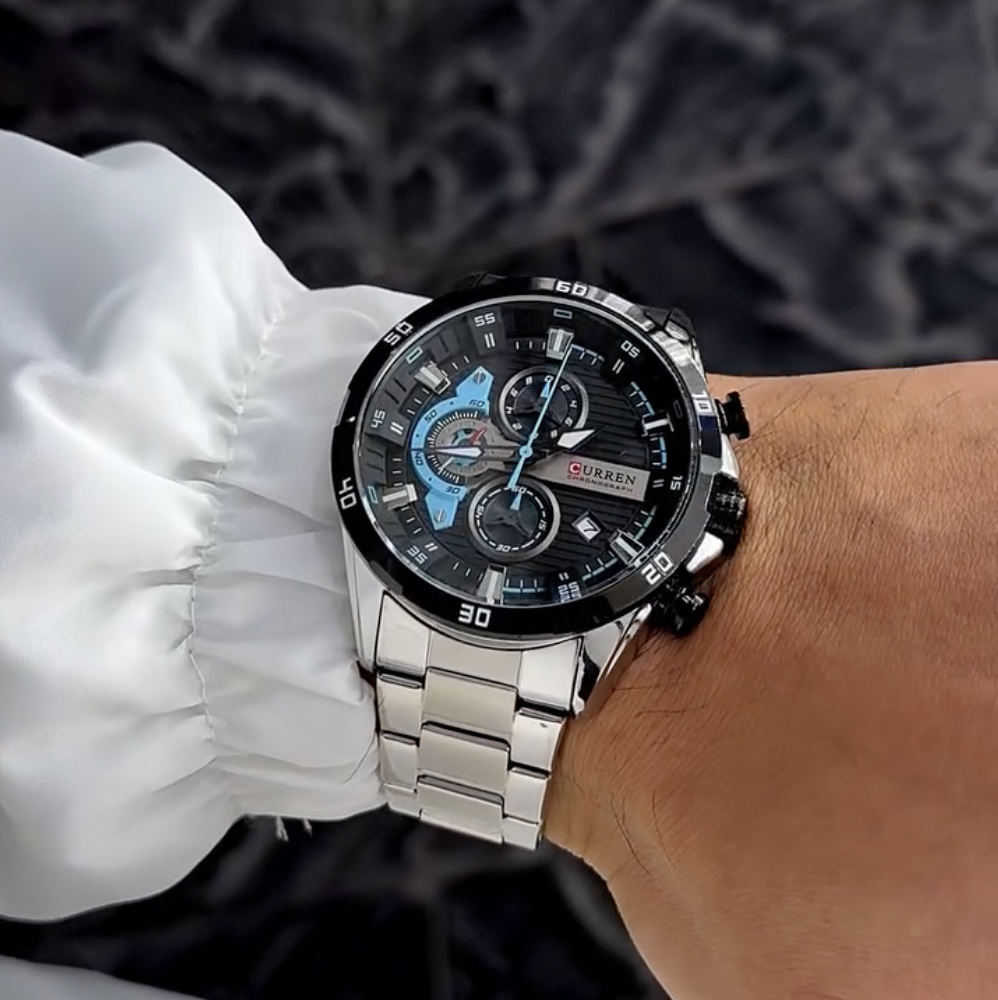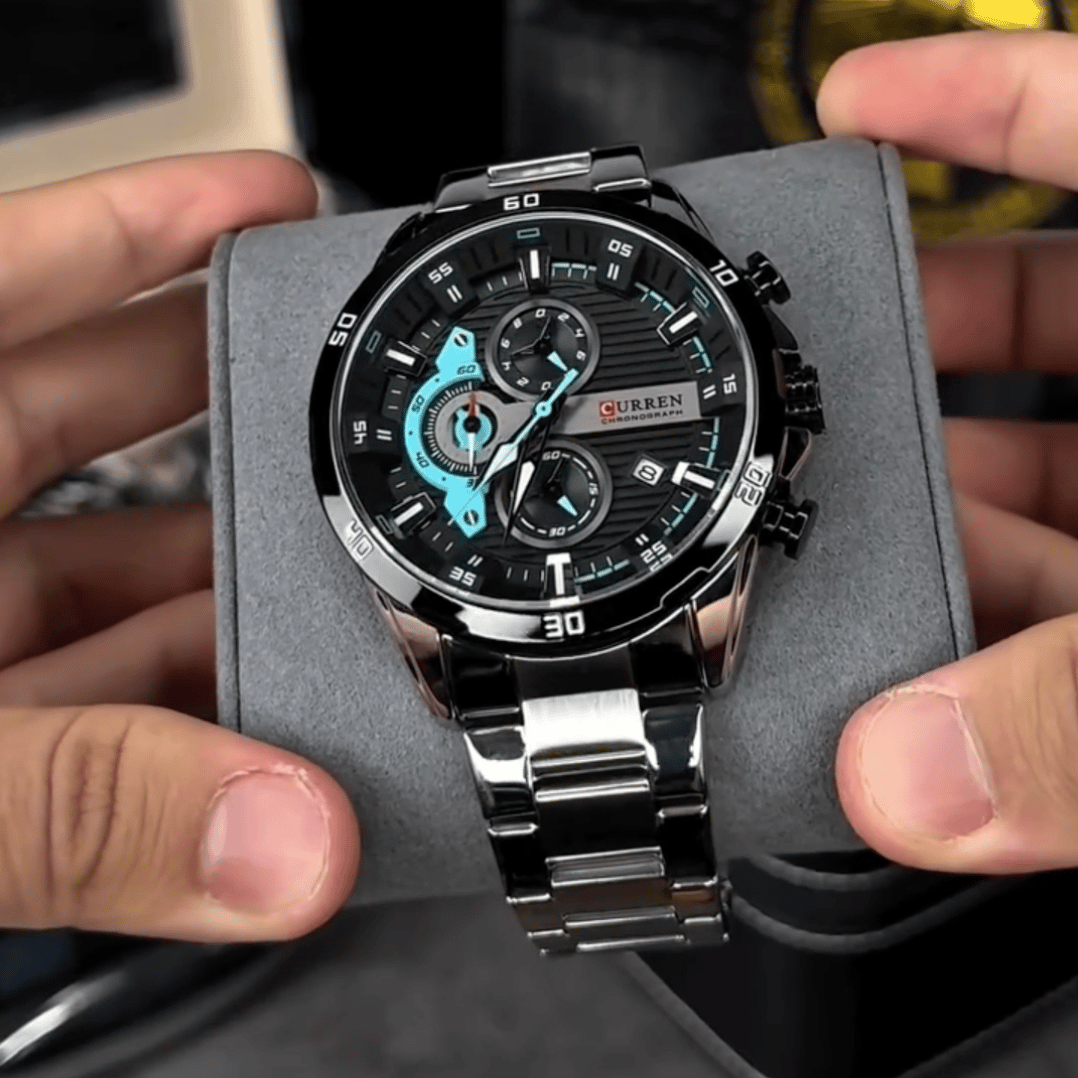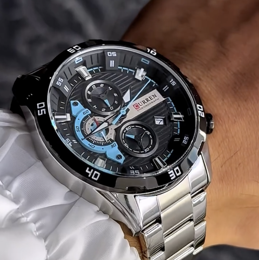 Cette montre CURREN se distingue par son allure résolument sportive et contemporaine. Son cadran noir texturé, souligné par des détails bleus électriques et argentés, capte immédiatement le regard. Les sous-cadrans fonctionnels ajoutent du relief et du caractère, tandis que les aiguilles aux formes angulaires renforcent son esthétique technique. Ce modèle s’adresse aux amateurs de style affirmé qui recherchent une montre à la fois fonctionnelle et pleine de personnalité.