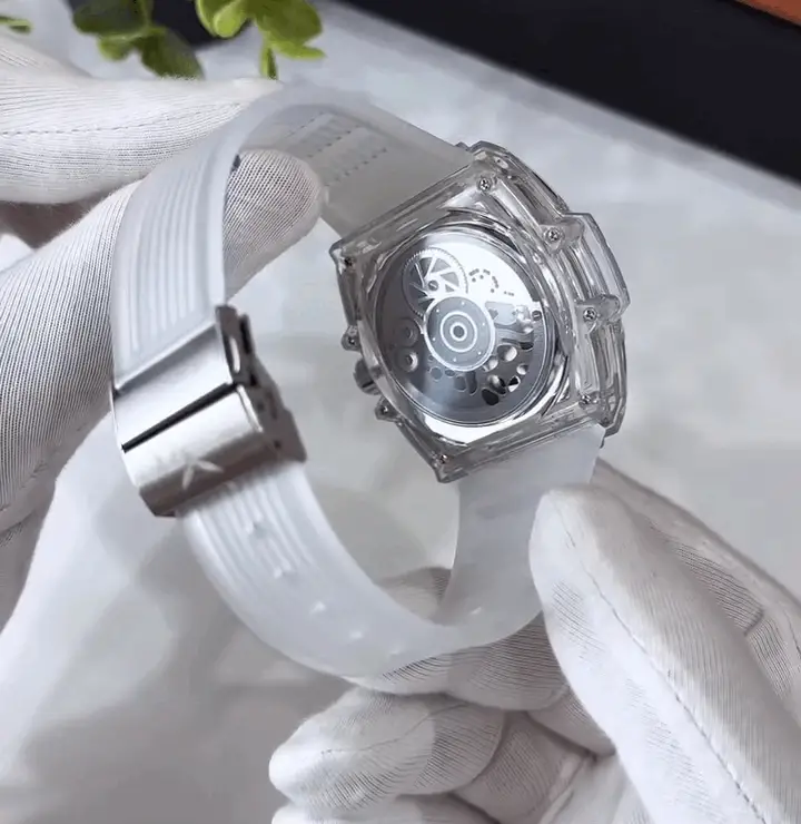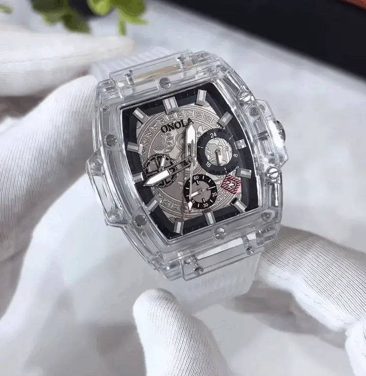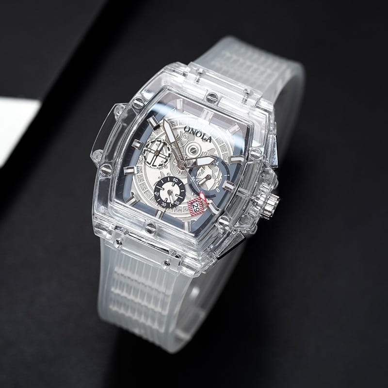 La montre ONOLA arbore un design futuriste et saisissant qui ne laisse personne indifférent. Son boîtier rectangulaire en résine transparente, orné de vis apparentes, lui confère un style à la fois industriel et élégant. Le bracelet translucide, assorti au boîtier, ajoute une touche de modernité tout en assurant un confort optimal au poignet.