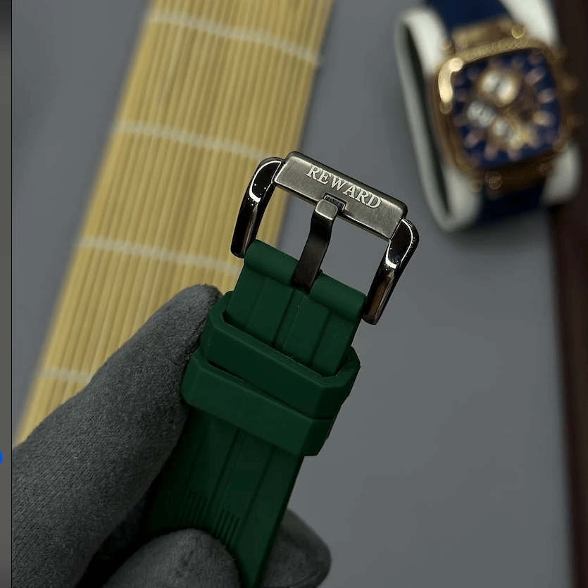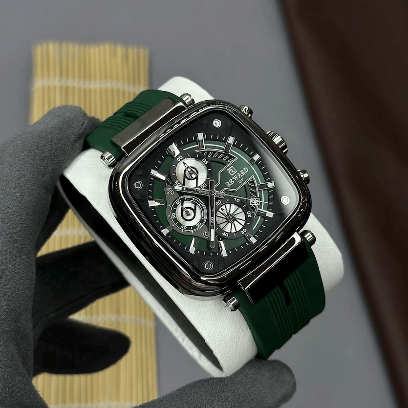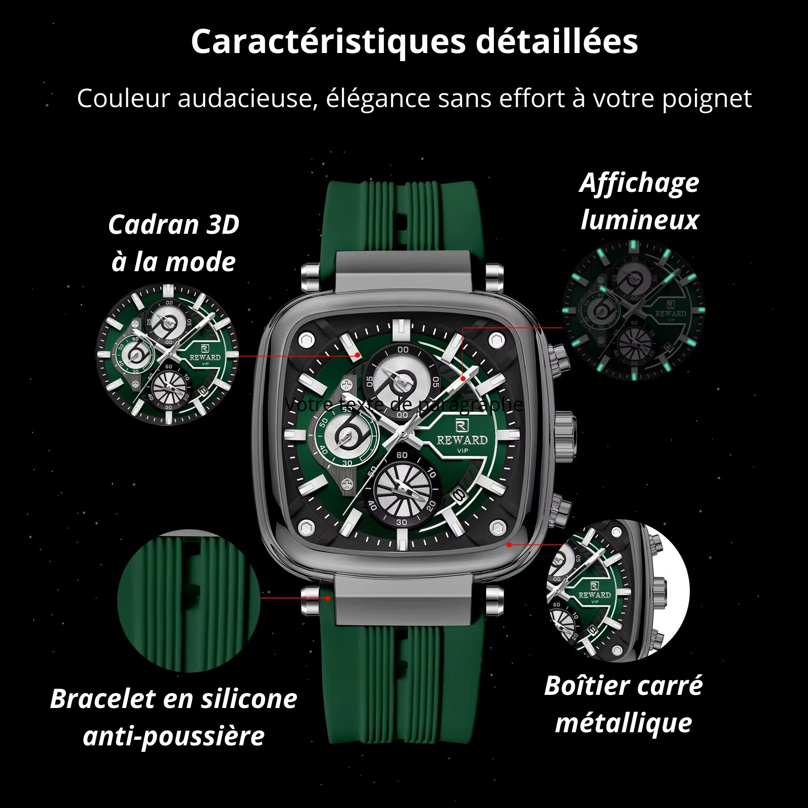 Cette montre allie élégance et caractère avec son boîtier carré métallique et son cadran 3D à la mode. Son design unique, aux détails raffinés, met en valeur un style contemporain qui s’adapte aussi bien aux occasions formelles qu’aux tenues décontractées. La combinaison du vert profond et de l’acier inoxydable en fait un véritable accessoire de distinction.