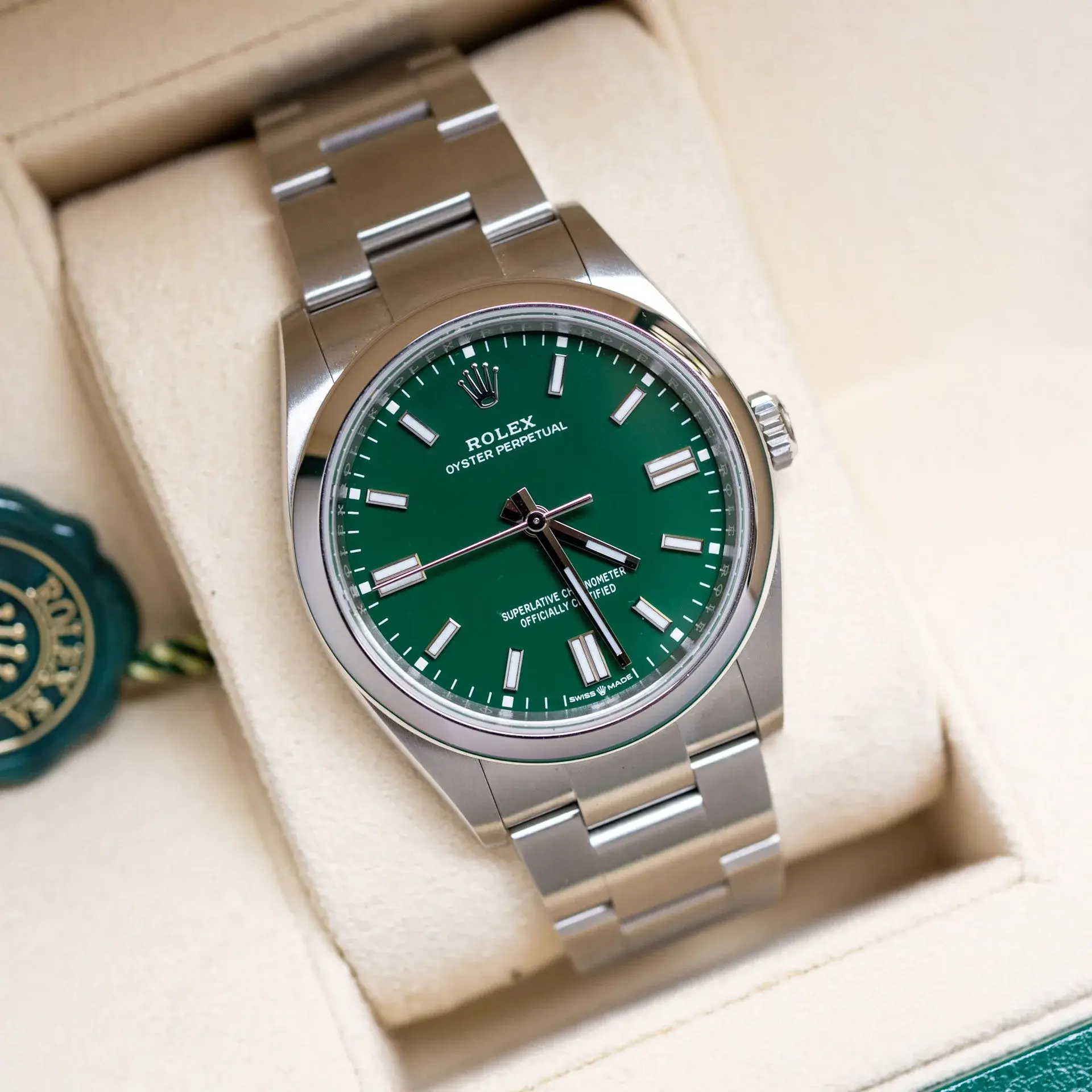 Cette montre incarne parfaitement le raffinement et la précision horlogère. Dotée d’un cadran vert intense et lumineux, elle attire immédiatement le regard tout en conservant une élégance discrète. Son design épuré, accompagné d’index bâtons en acier poli et d’aiguilles luminescentes, assure une lisibilité parfaite et un style intemporel.